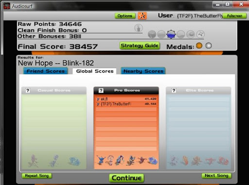 akj8...I am throwing down the gauntlet! Let the Battle of "New Hope" begin! I've already told you of Audio-Surf, the wonderfully fun puzzle racer I recently acquired via Steam. One of it's great features is that it collects the scores you achieve in various songs and compares them to anyone else who has played the song. Until this morning by virtue of me having been the only one to play it I had been the world record holder for "New Hope" by Blink-182.